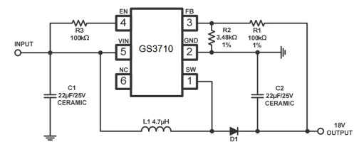 高效率1.2MHz,28V输出,2A升压调节器。GS3710工作频率为1.2MHz,可以使用高度小于或等于2mm的微型低成本电容器和电感器。内部软启动导致小涌流延长电池寿命。包括欠压锁定、电流限制和热过载保护,以防止损坏输出过载事件。